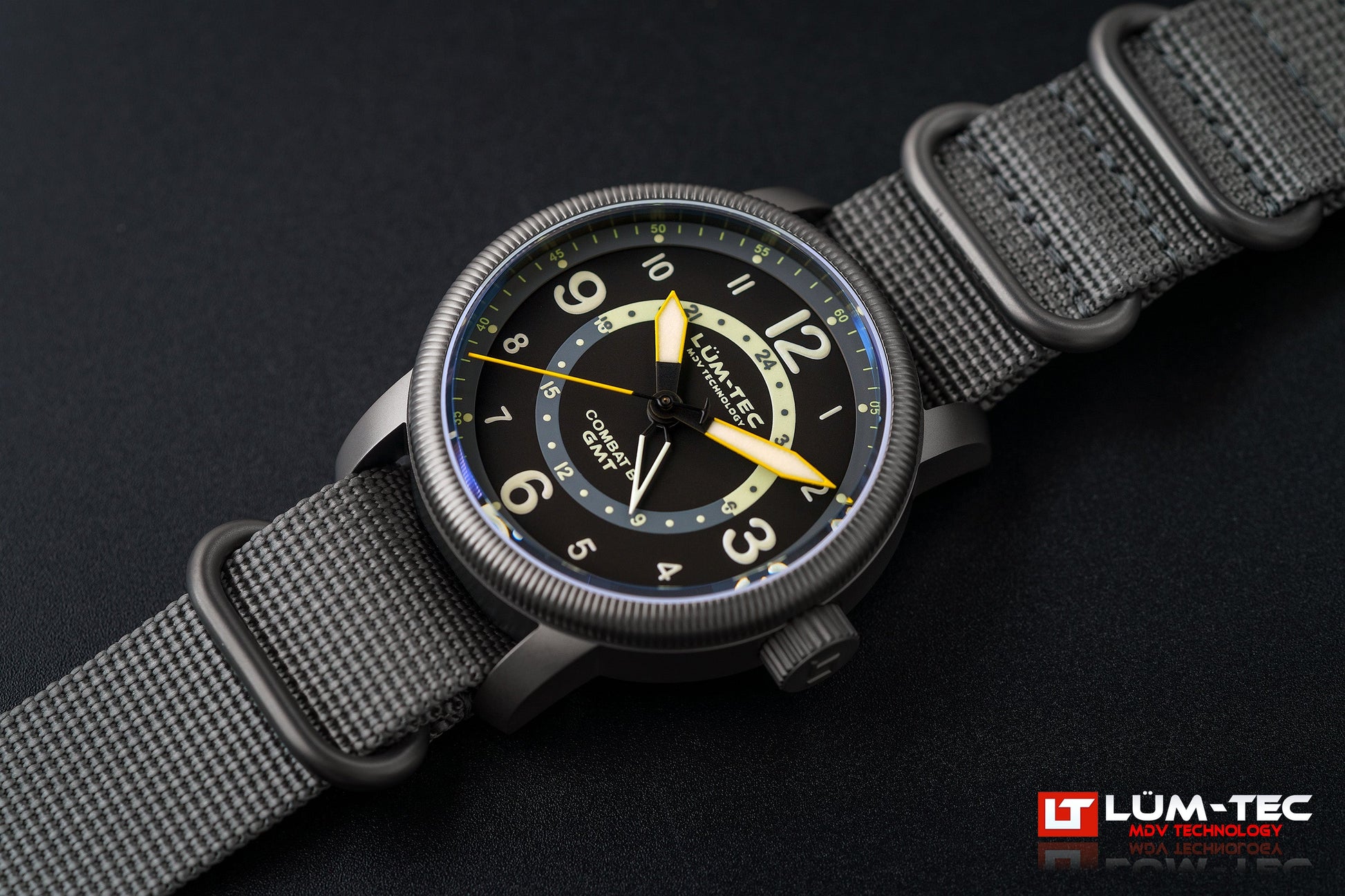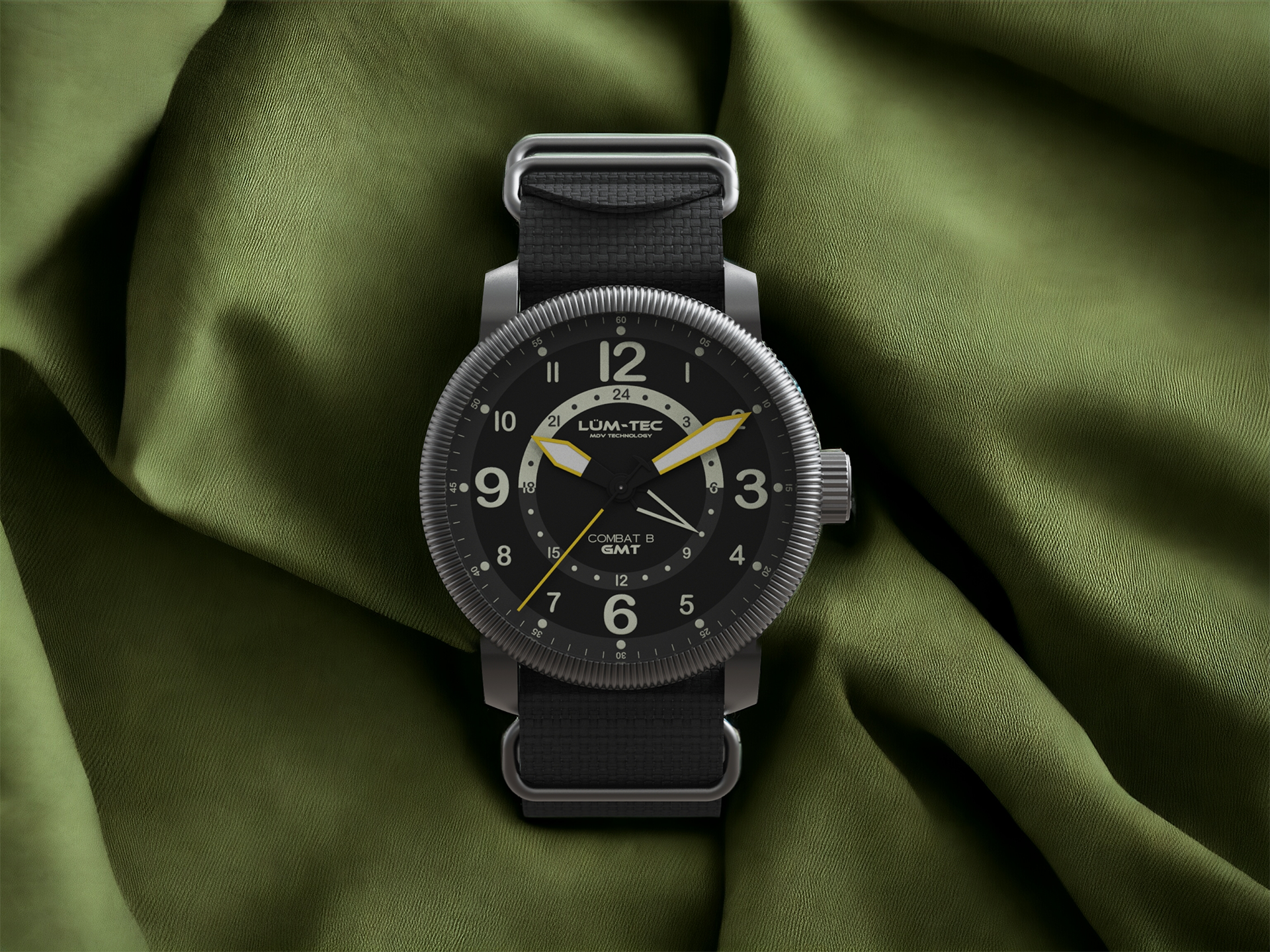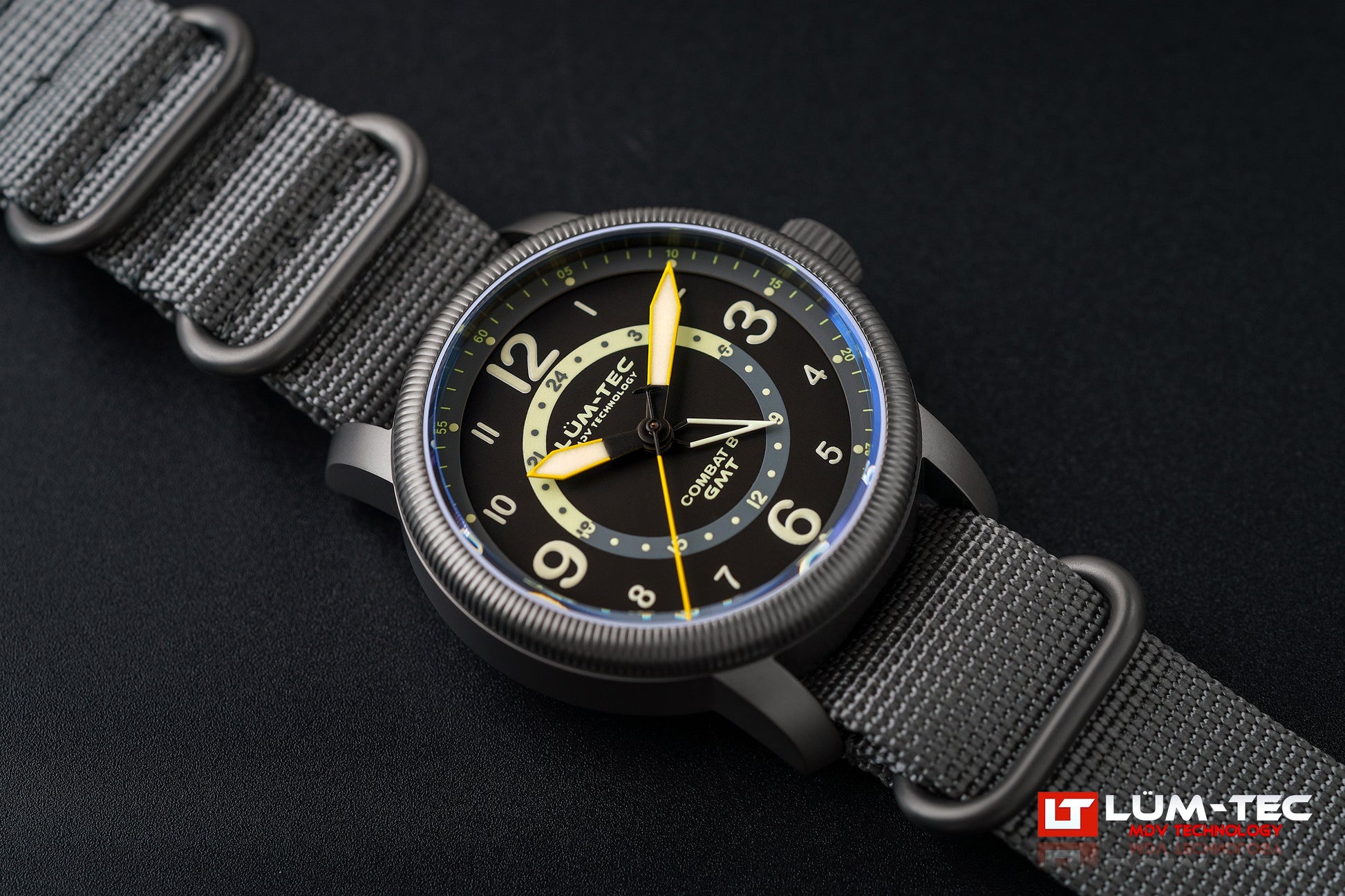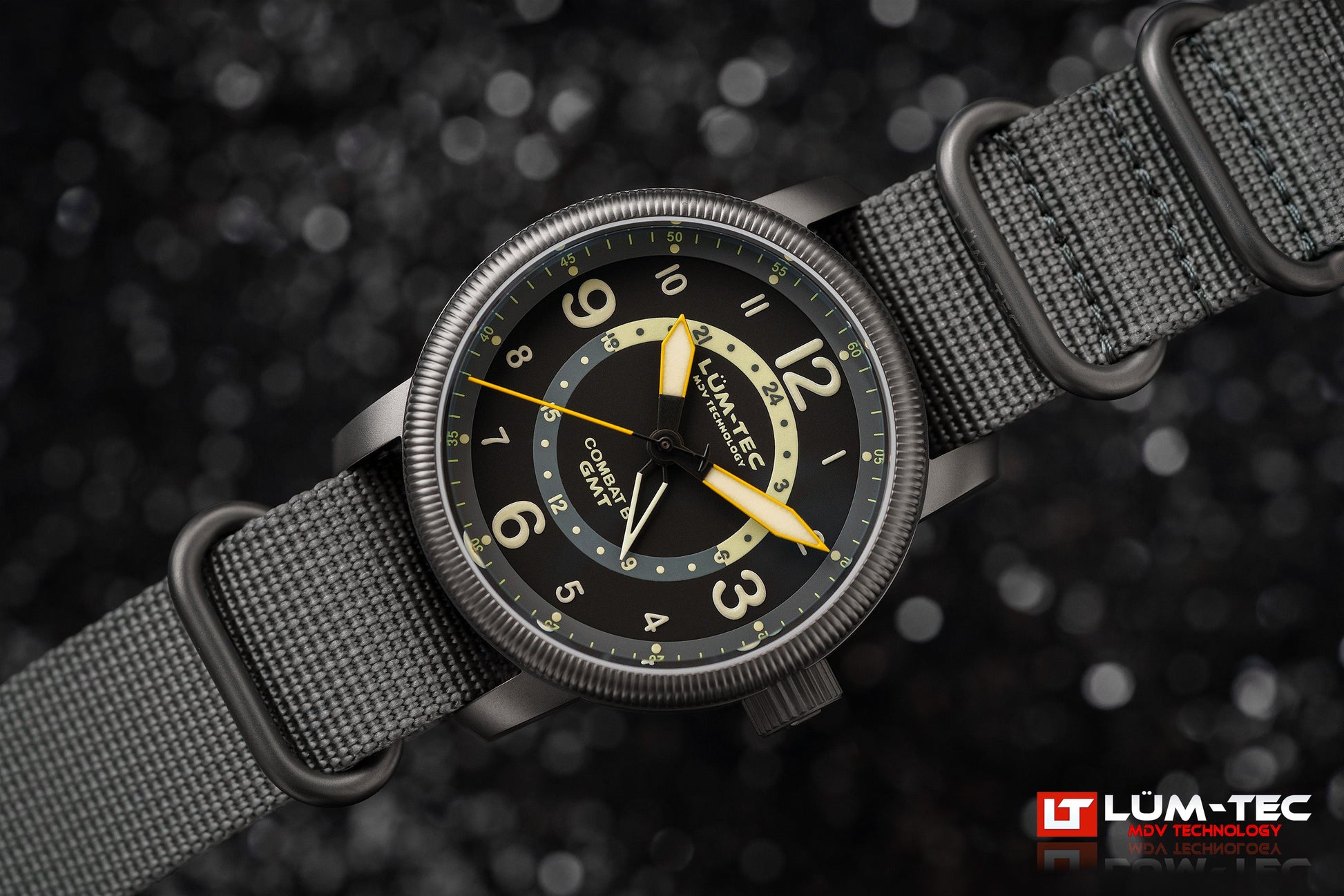 - Two military style straps included: One charcoal gray nylon and one tan leather with gunmetal PVD hardware
