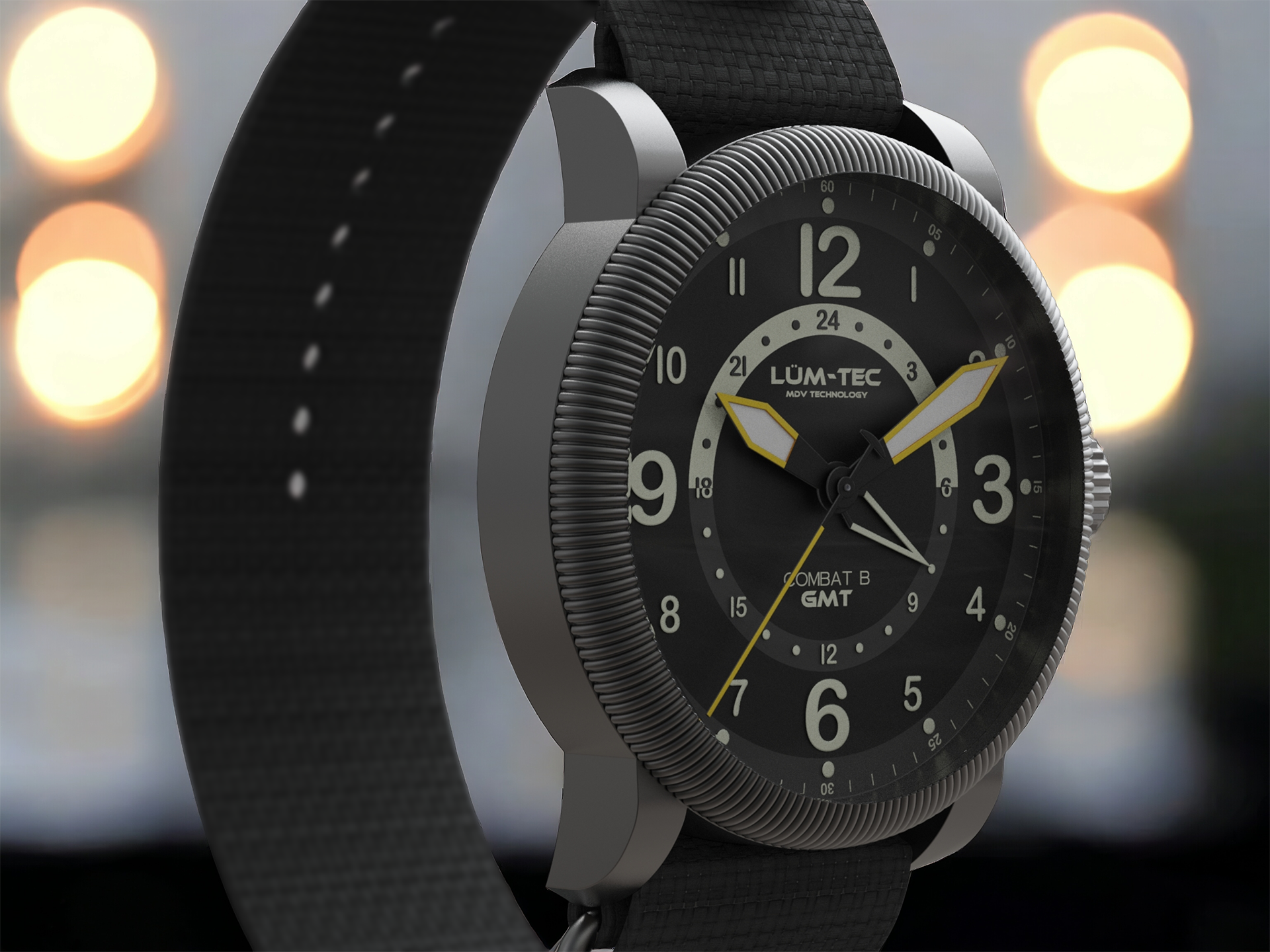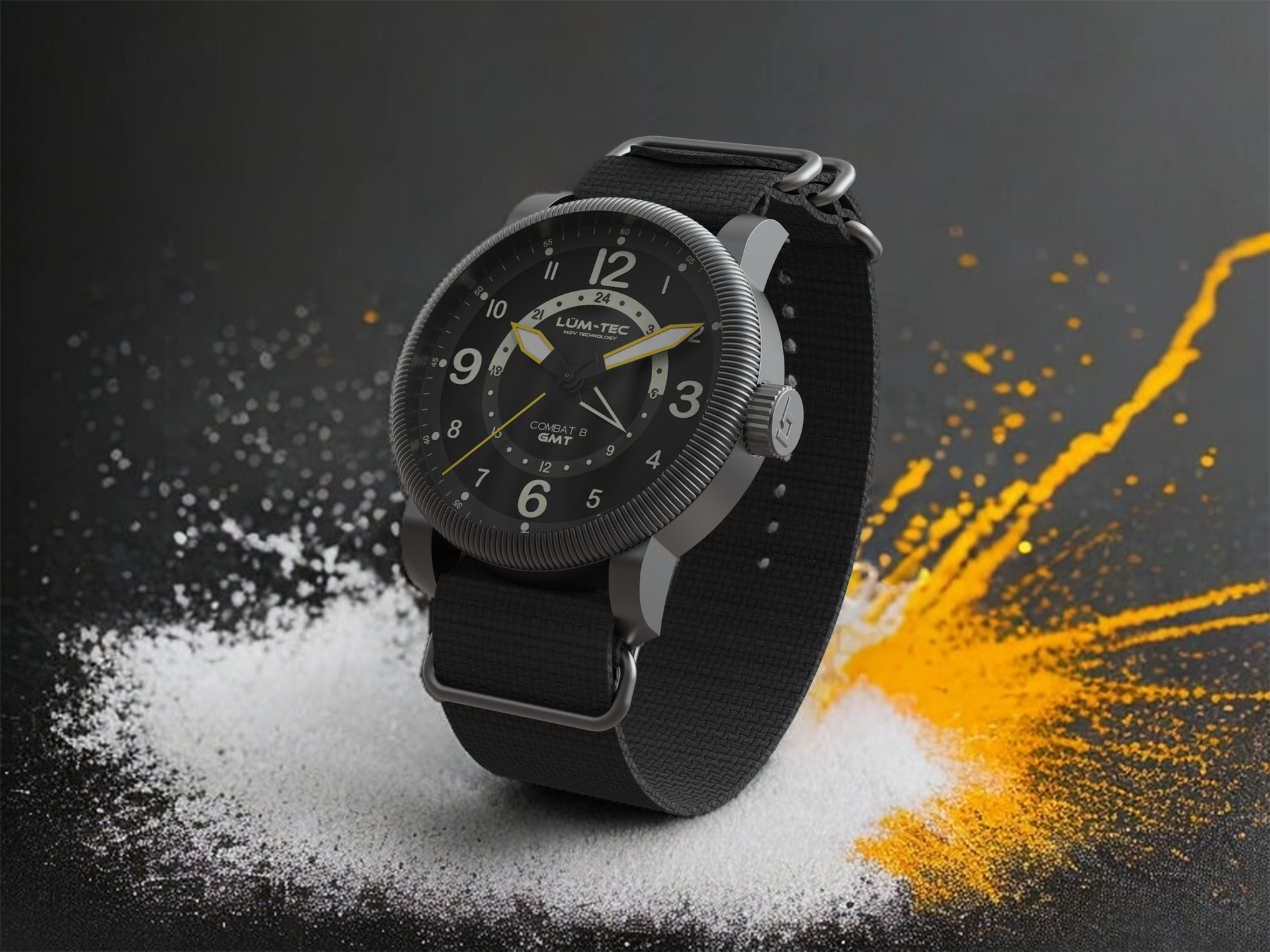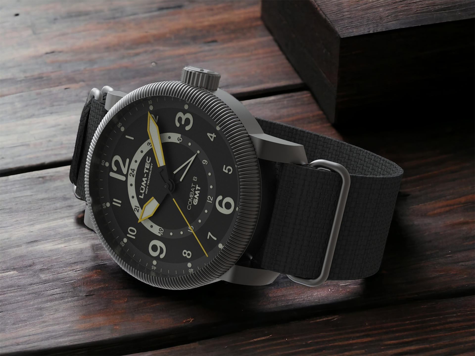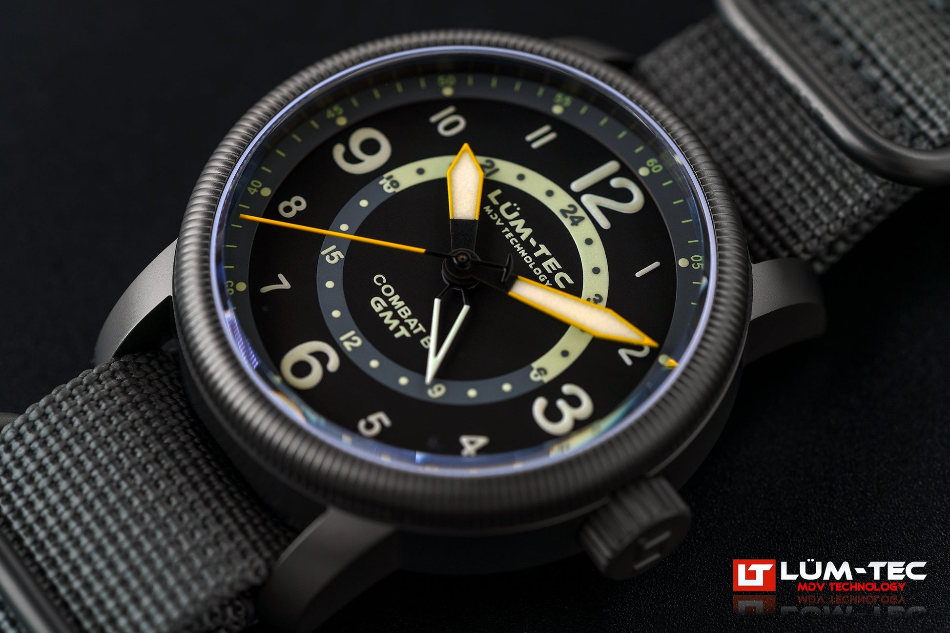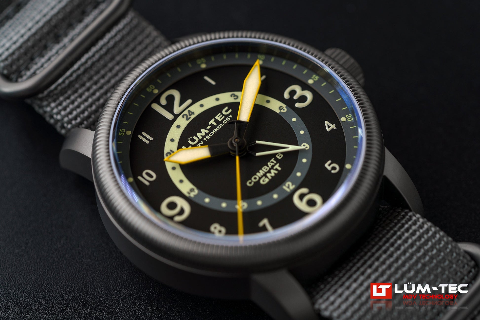 - Two military style straps included: One charcoal gray nylon and one tan leather with gunmetal PVD hardware