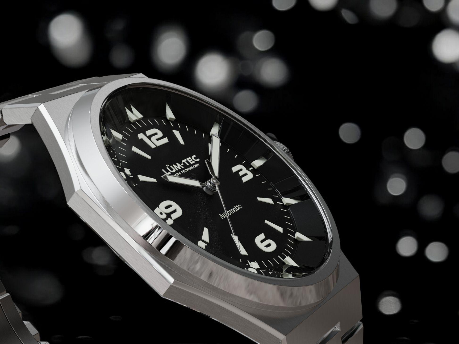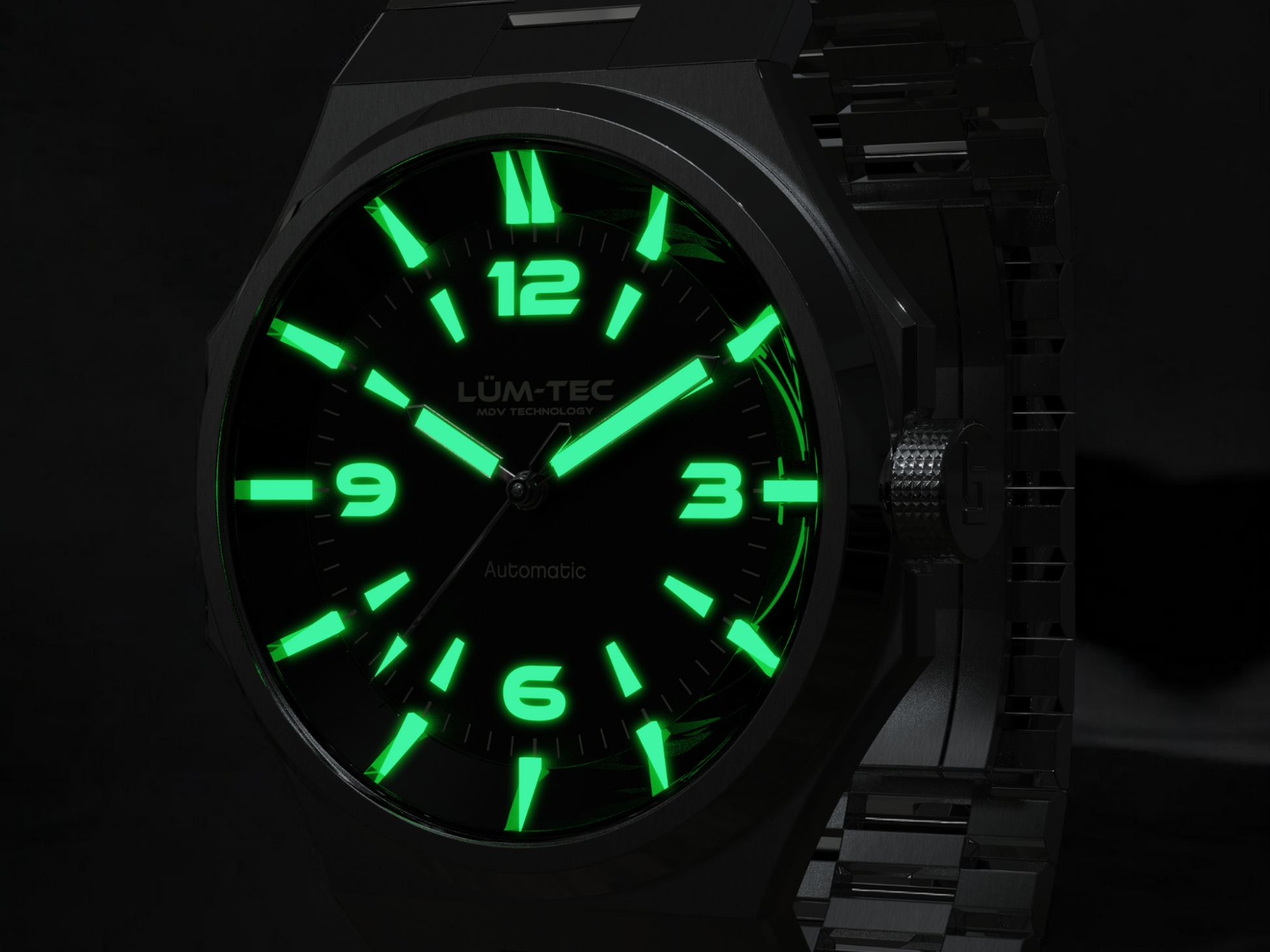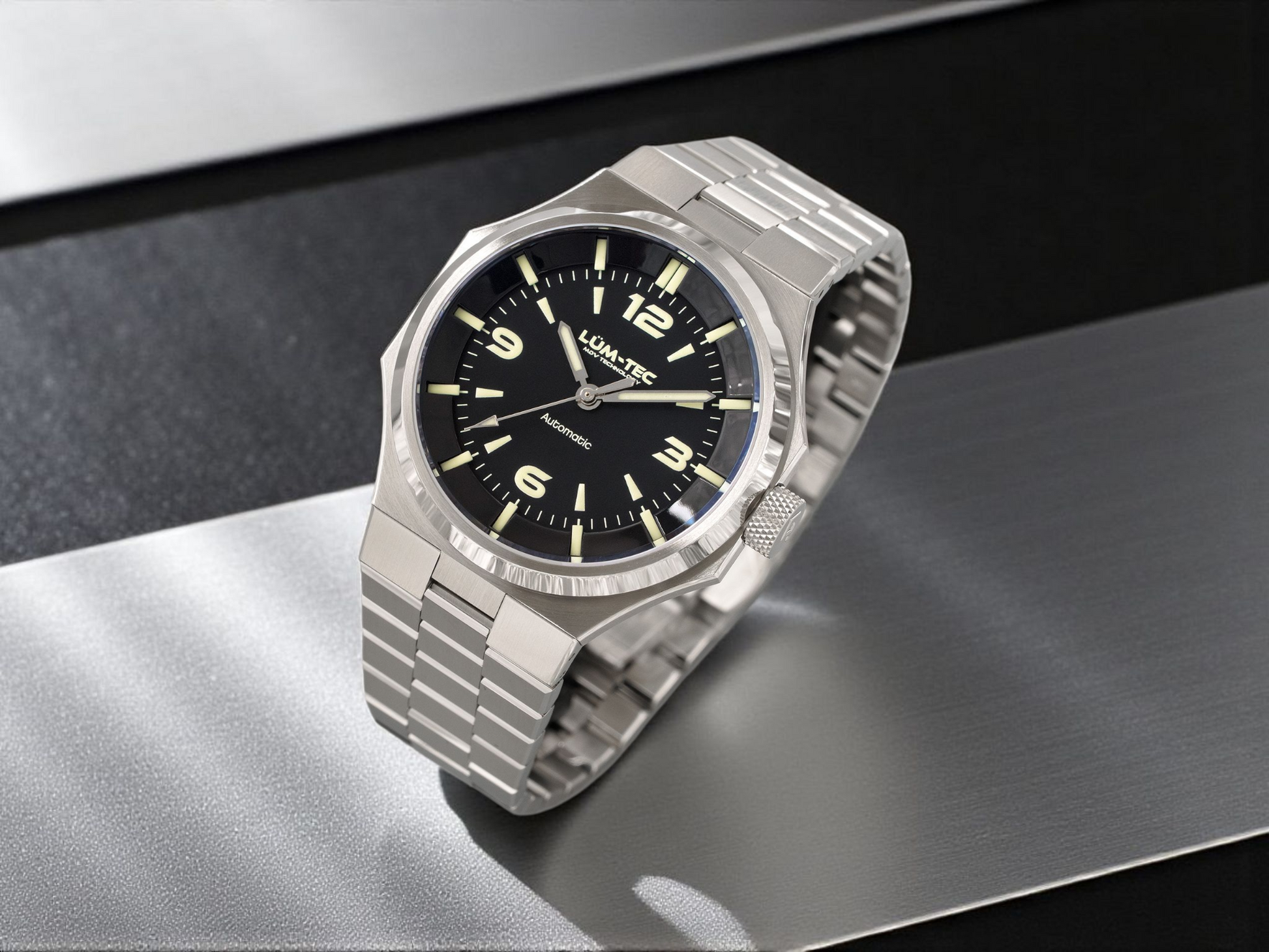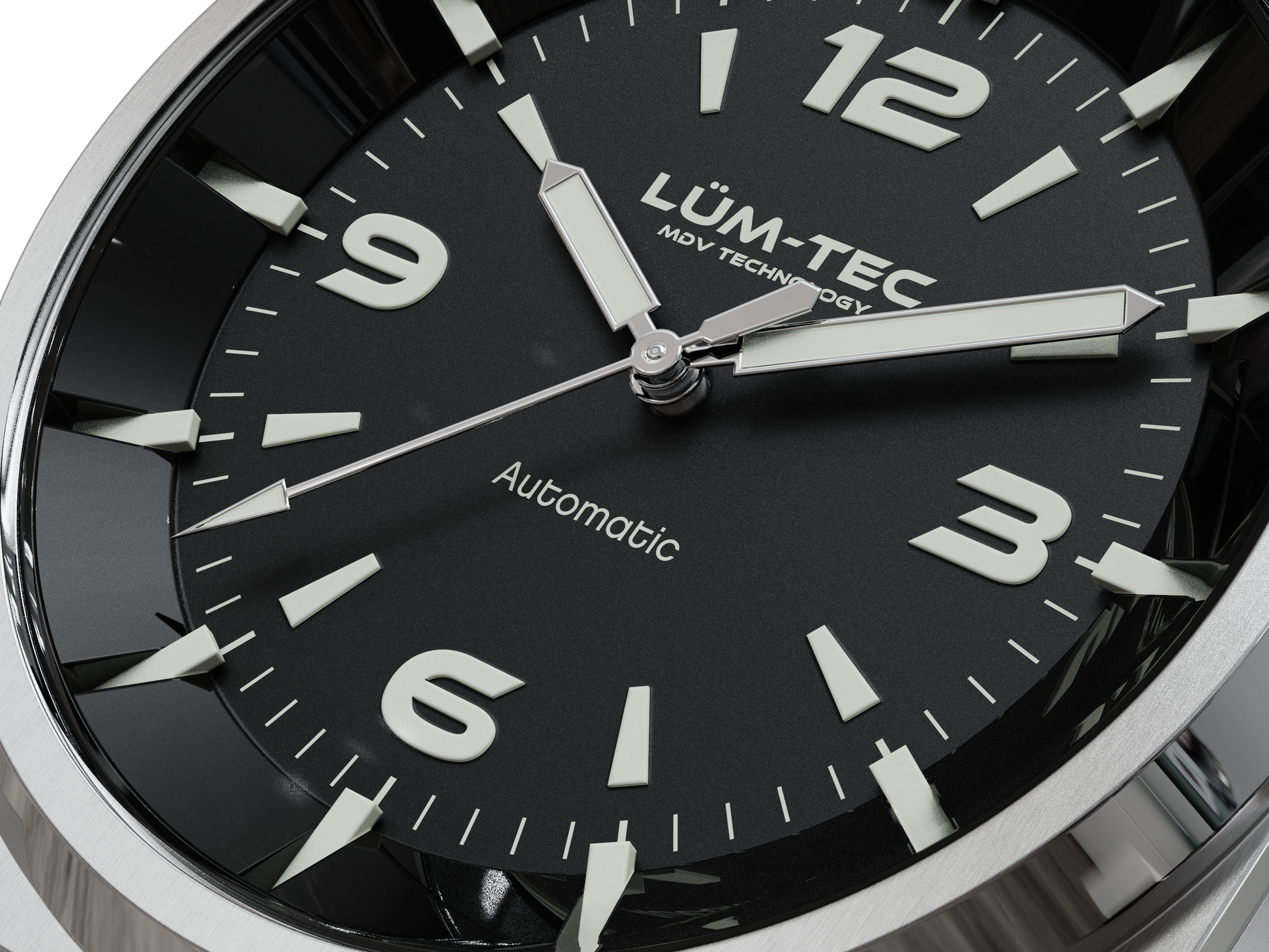 - Bi-layer matte and lacquer black 3D dial with extruded luminous index