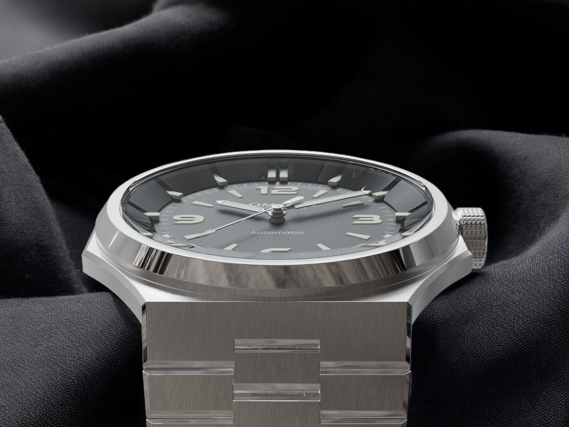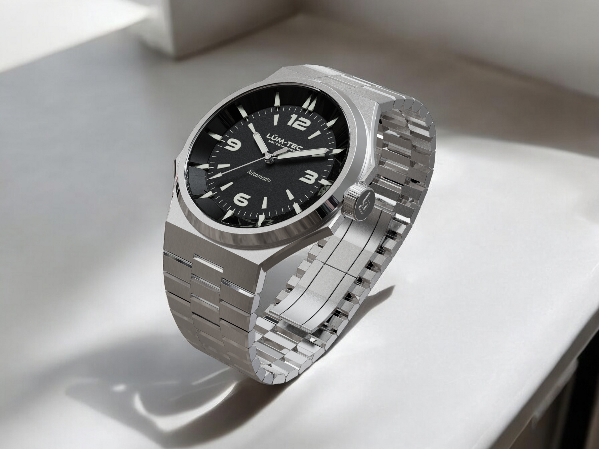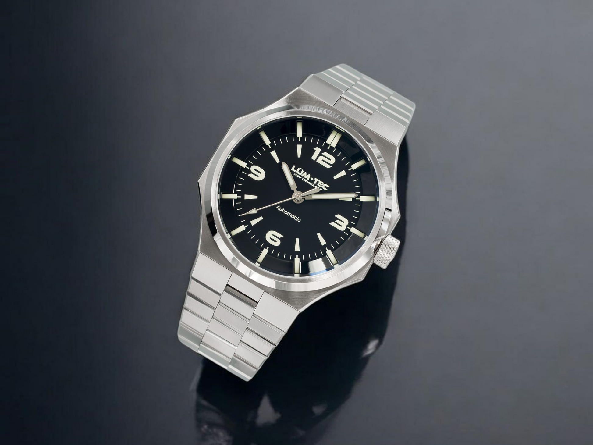 - Bi-layer matte and lacquer black 3D dial with extruded luminous index