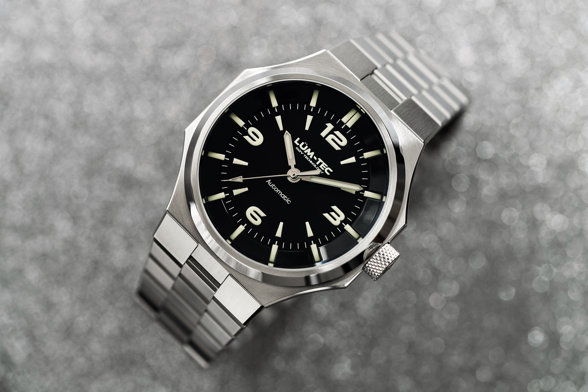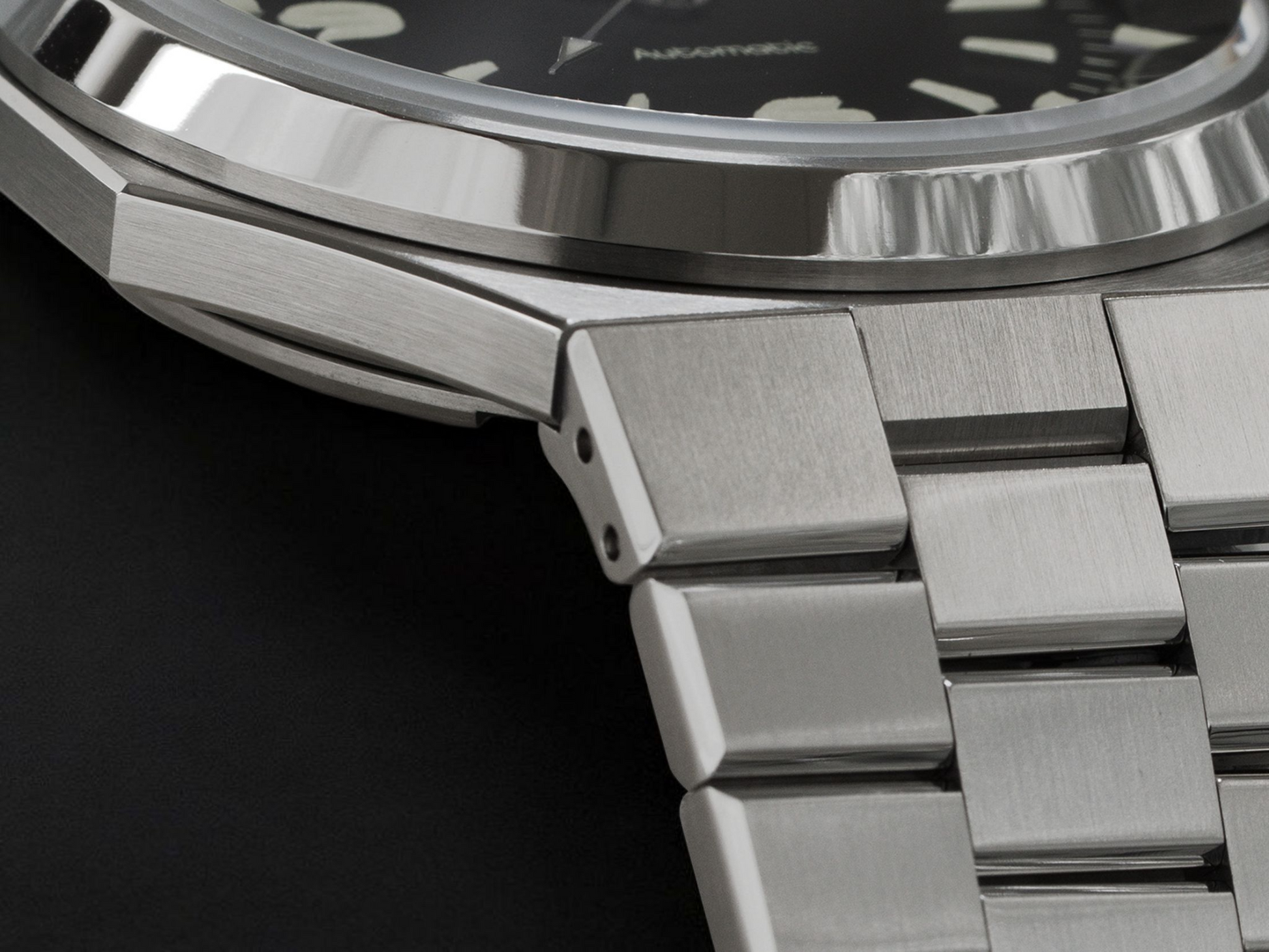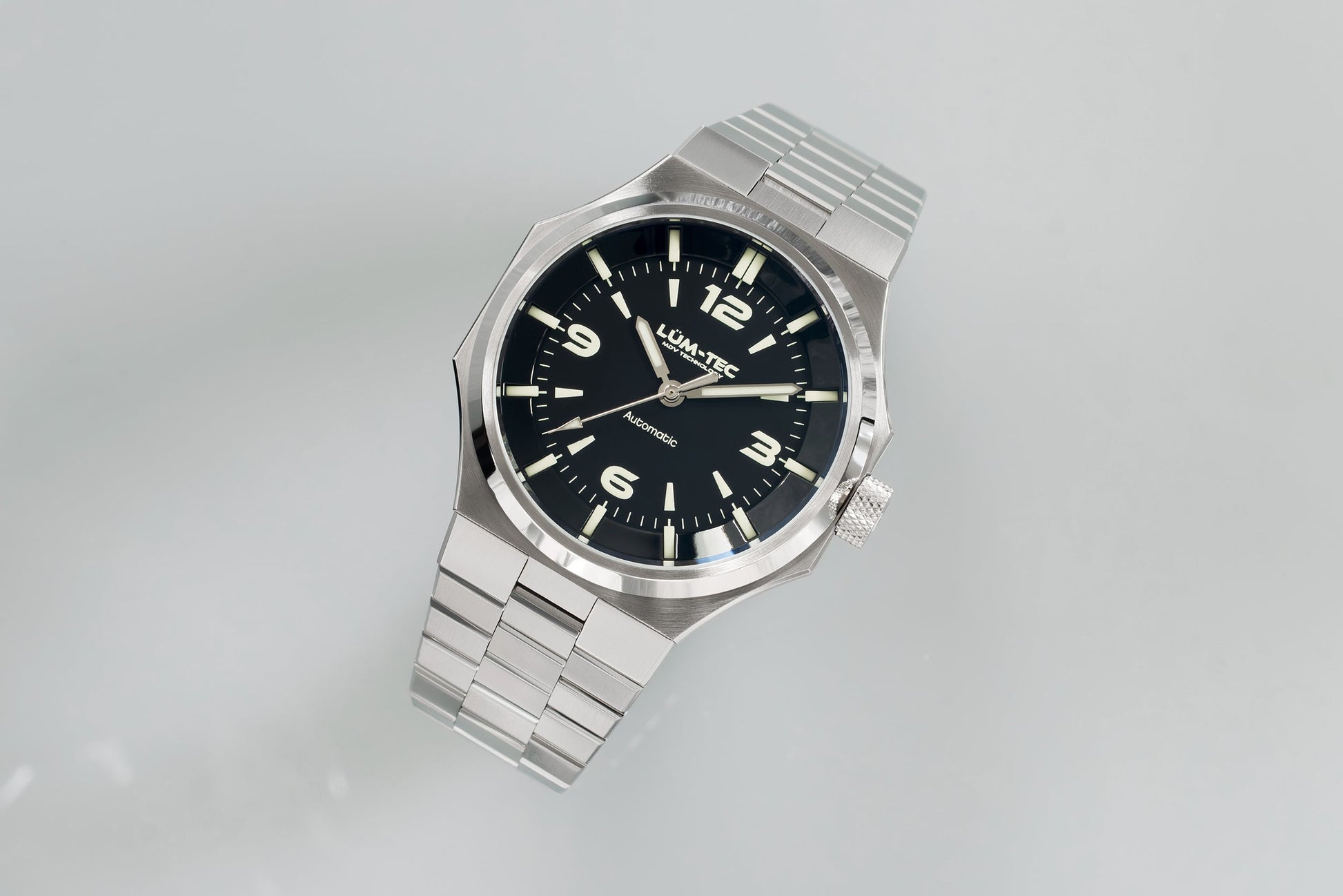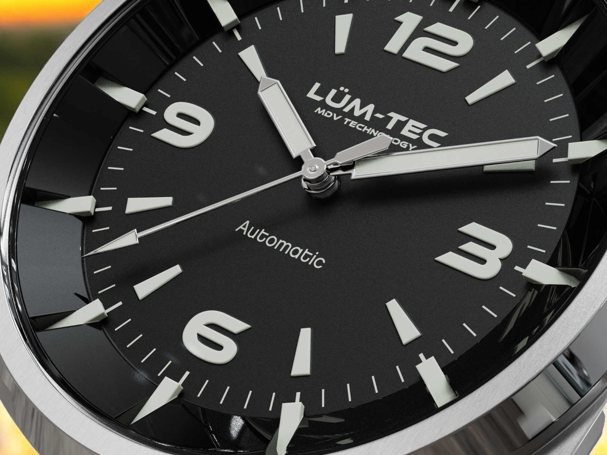 - Bi-layer matte and lacquer black 3D dial with extruded luminous index